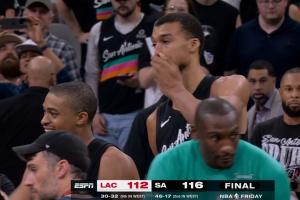 GIF-马刺球员疯狂庆祝中~!!!文班亚马抱着福克斯有点泪目了~!!!